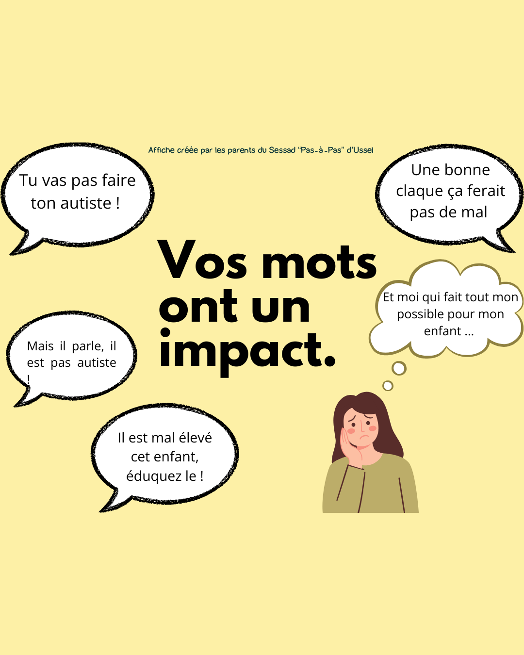 À l’occasion de la Journée mondiale de l’autisme le 2 avril 2024, les familles du SESSAD « Pas à Pas » d’Ussel ont pris part à un atelier d’écriture, s’associant ainsi au projet artistique mené par leurs enfants. Accompagnées par Lio et Estelle, les psychologues du service, elles ont exprimé leur vécu de parents d’enfants TSA à travers la création d’affiches poignantes.