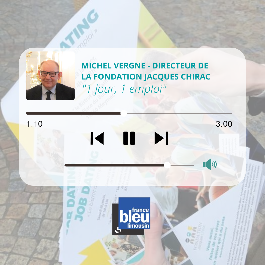 Demain, à 8h23, branchez vos radios sur la fréquence 102.3 !Michel Vergne, Directeur de la fondation, sera l’invité de France Bleu Limousin, dans l’émission « 1 jour, 1 emploi » pour présenter le prochain Job dating.A ne pas louper !